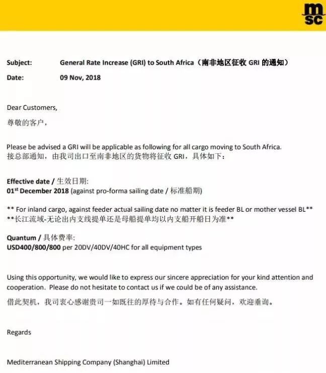 尊敬的客户,出口至南非地区的货物将征收GRI,具体如下: